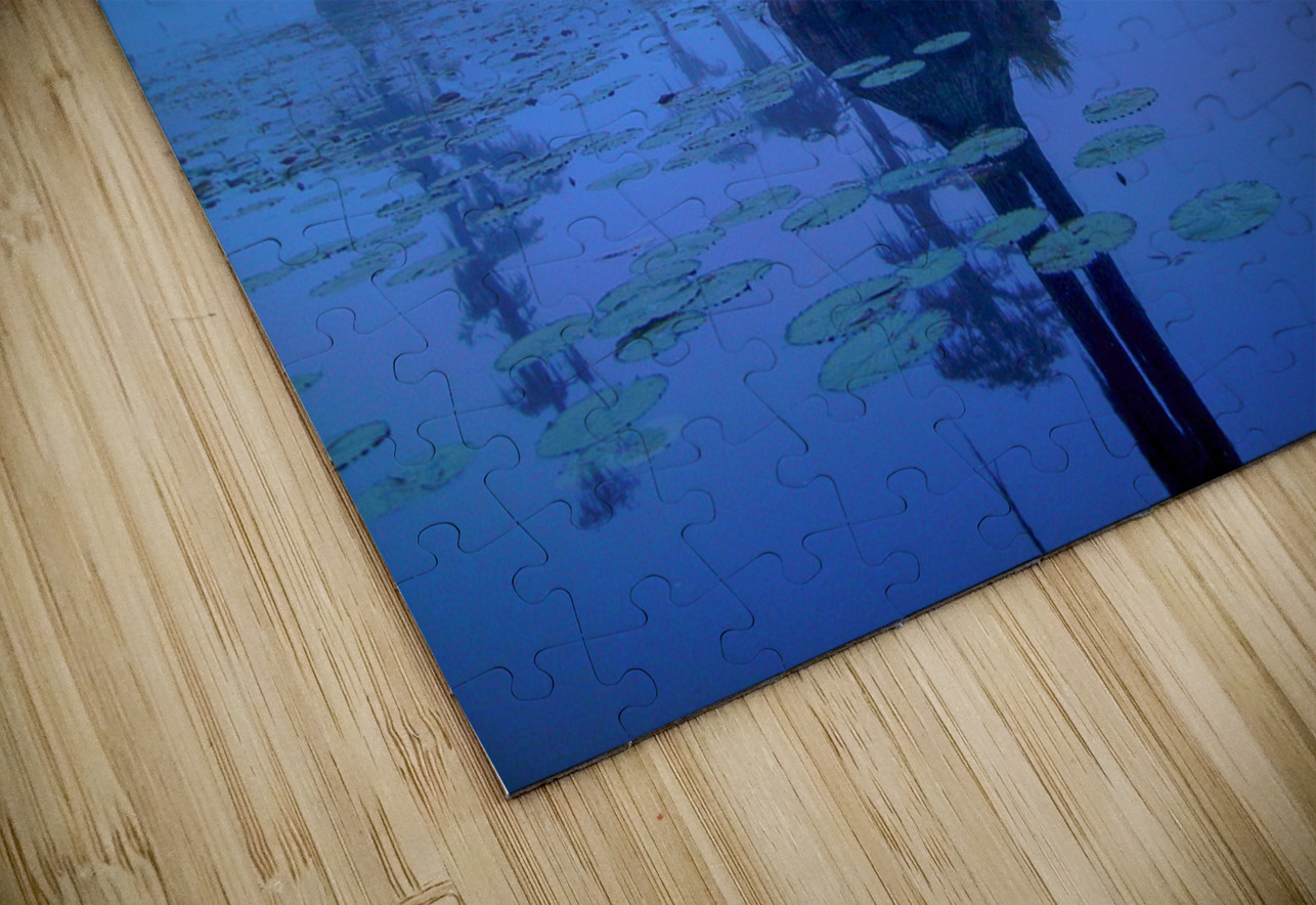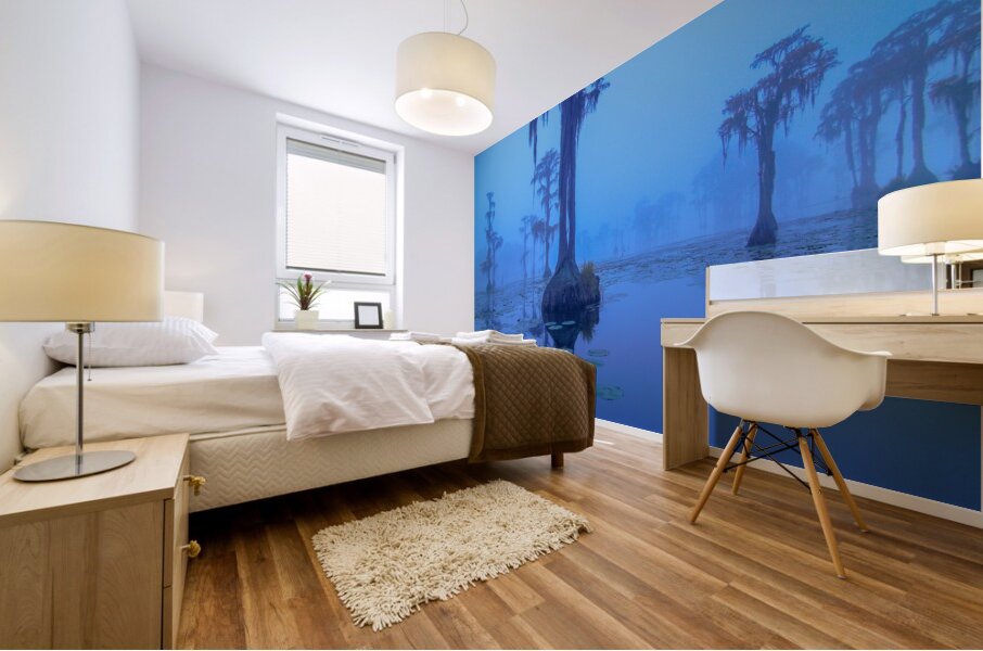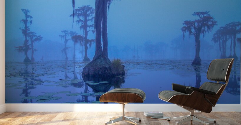 This captivating image showcases a serene, fog-laden swamp at dawn, featuring iconic cypress trees draped in Spanish moss. Their reflections ripple softly in the tranquil water, surrounded by floating lily pads. The ethereal blue tones create a mystical and calming atmosphere, transporting the viewer to the quiet beauty of the southeastern United States' wetlands. Perfect for lovers of nature, tranquility, and Southern landscapes.