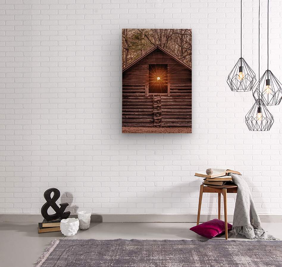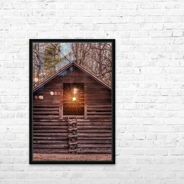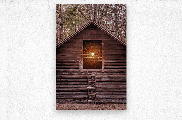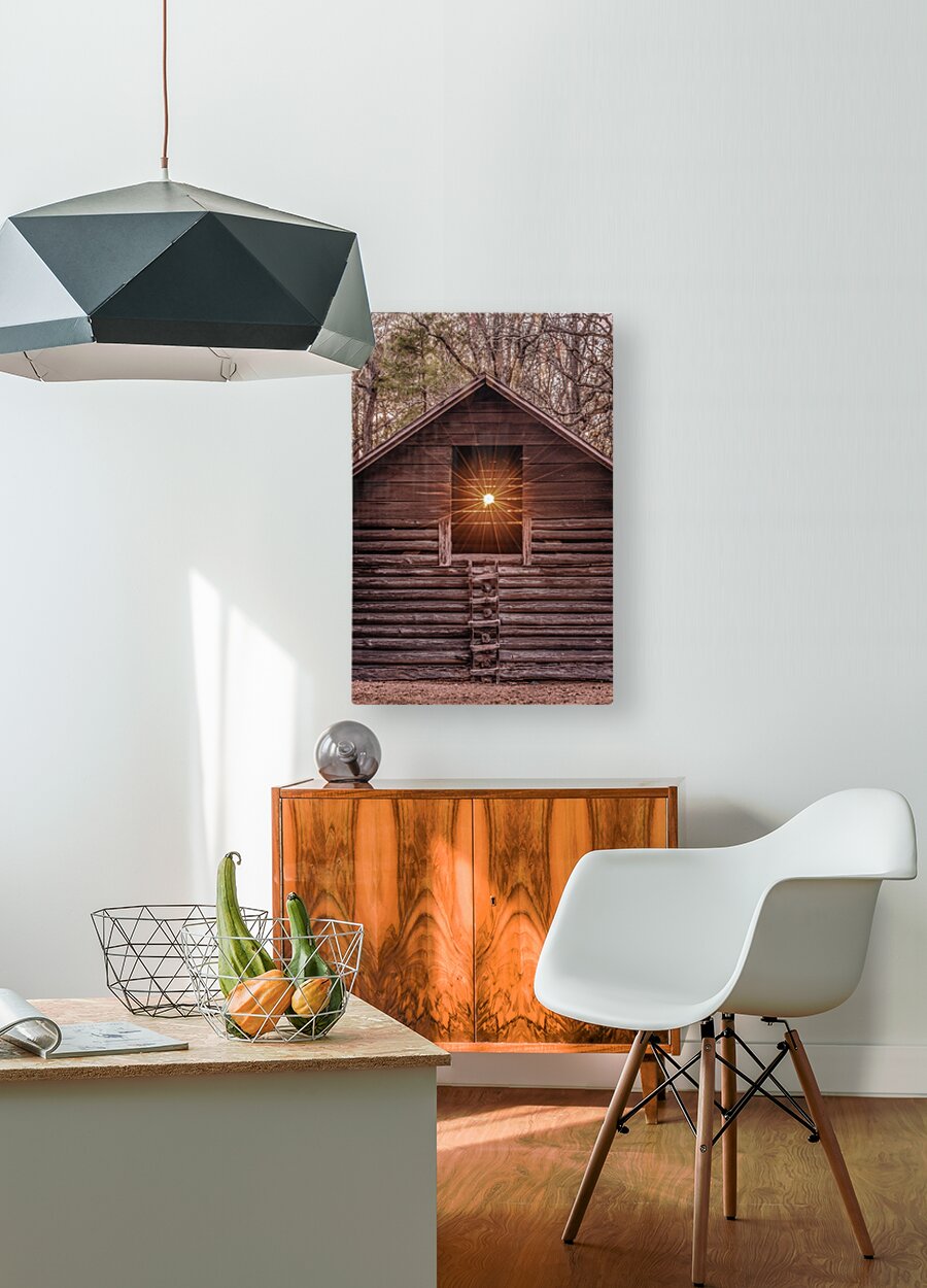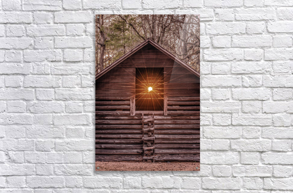 A radiant sunset beams through the window of a rustic log barn, highlighting its timeless craftsmanship and natural surroundings.