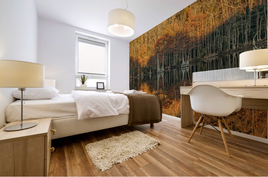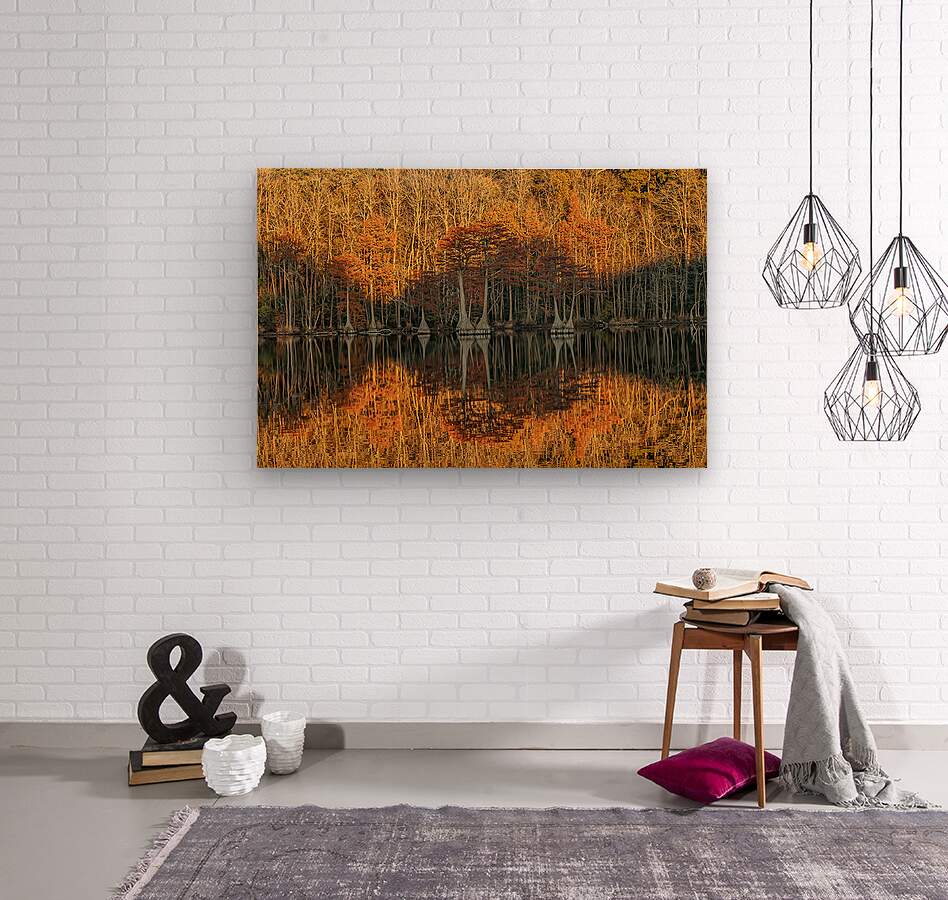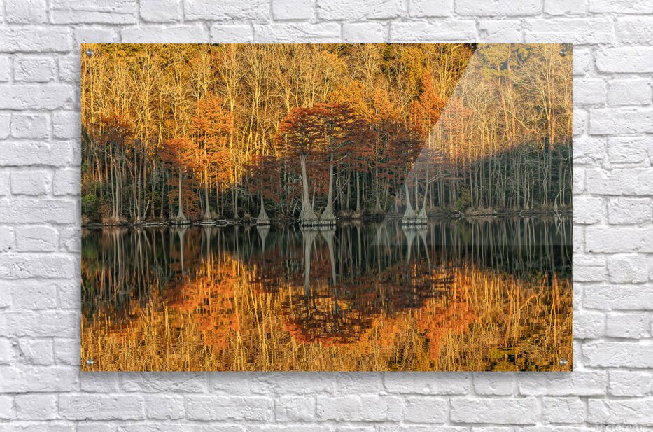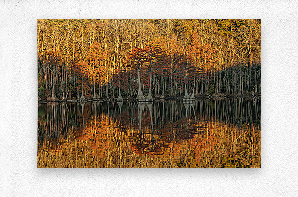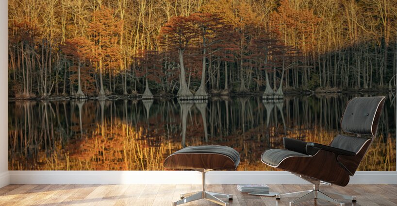 In the stillness of late autumn, the sun leans low across the water and ignites the cypress crowns into a quiet fire. Their trunks rise like pillars in a natural cathedral, mirrored with perfect symmetry in the glassy lake below. In this rare moment of light and reflection, the forest seems to breathe — ancient, luminous, and entirely at peace.