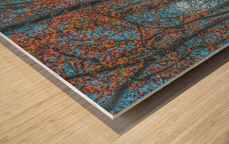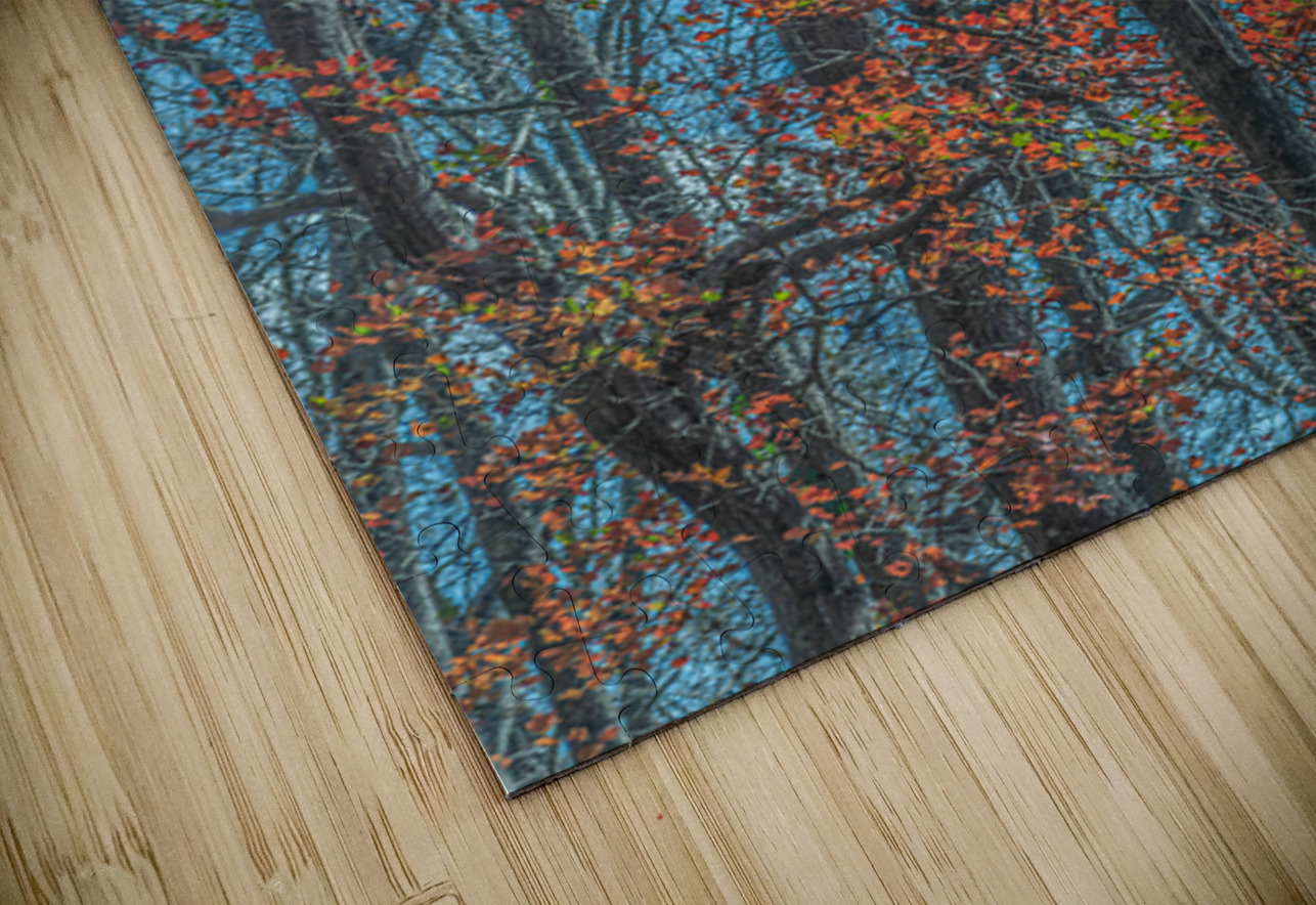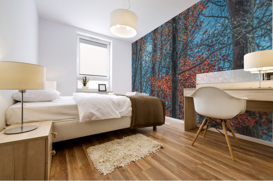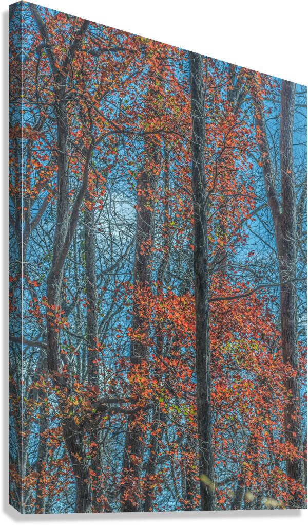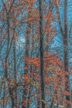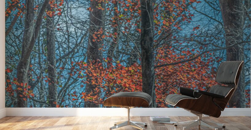 Red leaves blaze against winter trunks, singing the last bright song before silence returns