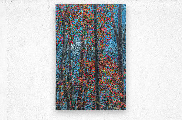 Red leaves blaze against winter trunks, singing the last bright song before silence returns